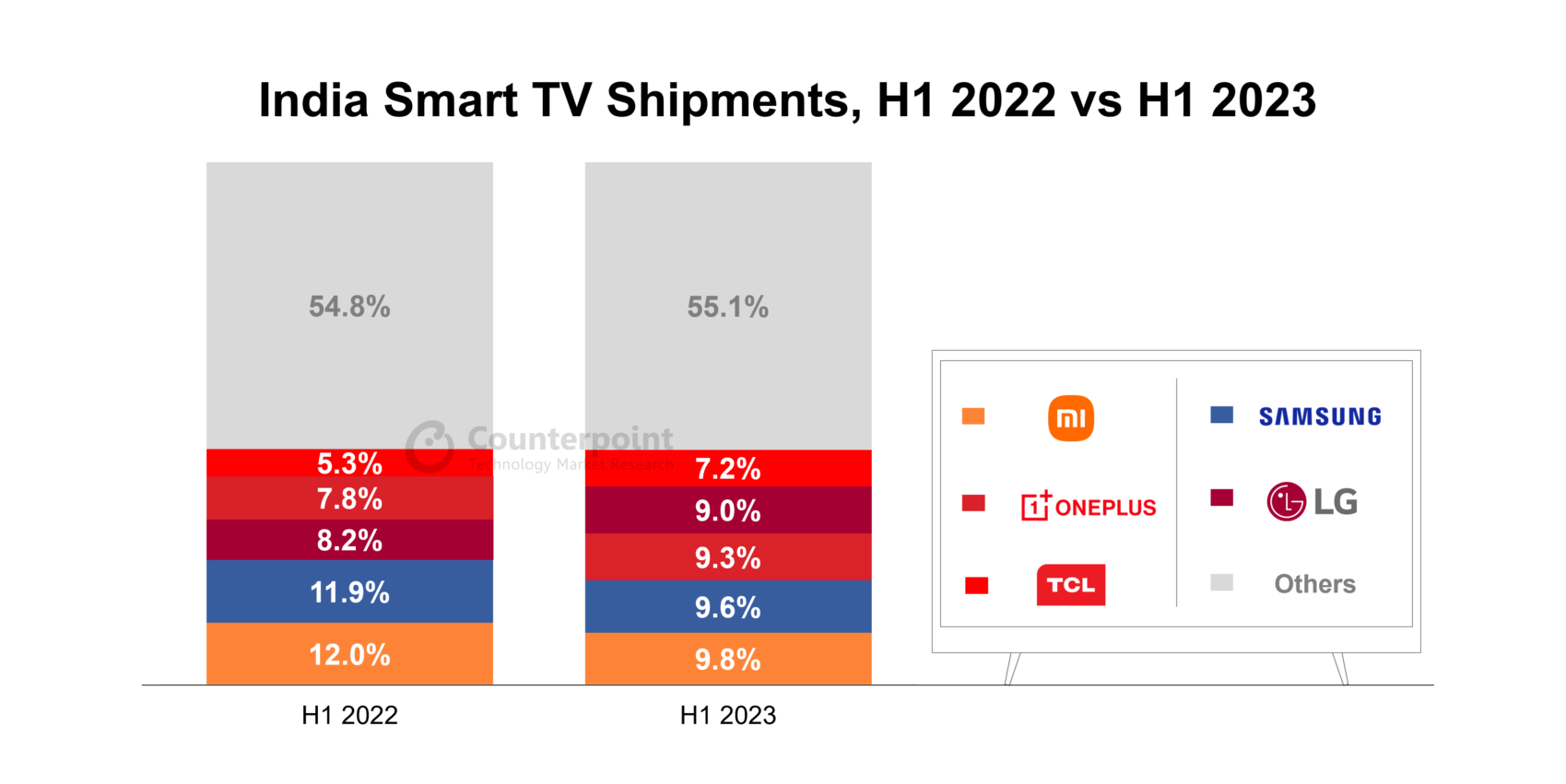 依据Counterpoint物联网服务的最新研讨报告,2023年上半年,印度智能电视出货量同比下降5%,其首要原因是该国通胀暴虐以及其他宏观经济不利要素,迫使人们仅购买必需用品。